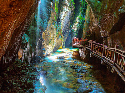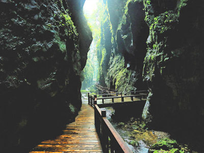 朝陽(yáng)地縫一線(xiàn)天景區(qū)位于張家界慈利縣趙家埡水庫(kù)底部,是一個(gè)外河流入型的水底大溶洞,洞高30—80m,寬道5—25m,全長(zhǎng)1550m,洞穴廊道呈峽谷狀態(tài),走向由南向北穿山而過(guò),落差80余米,形成于高山峰叢喀斯特峽谷流域,深切河床滲漏石灰?guī)r斷層層里裂隙,向含水層集中循環(huán),再經(jīng)溶蝕、侵蝕崩塌作用,形成與原河道平行的地下通道,是喀斯特區(qū)過(guò)境河的伏流河。